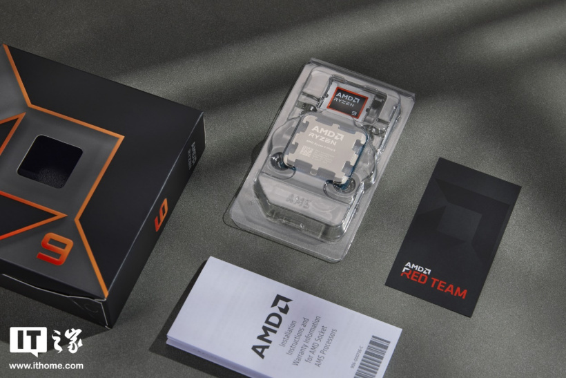 包装内部拥有自带塑封壳的 9900X 芯片本体,简易产品手册以及一张小卡片,去年那个让人误会的厚实泡棉块也变成了薄薄一片。