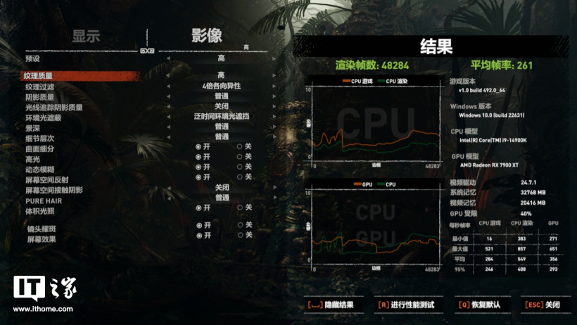 第一款是传统光栅 3A 游戏《古墓丽影:暗影》,通过自带基准测试: