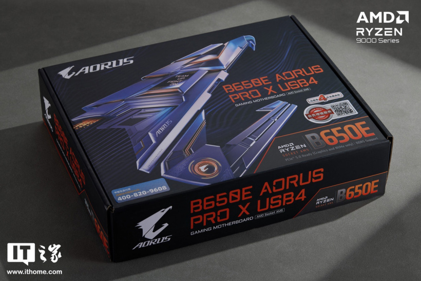 首先主板是来自技嘉的电竞雕 B650E AORUS PRO X USB4 主板,基于 AM5 平台,拥有 16+2+2 项供电,并做了供电区域、M.2 插槽和芯片组部分的散热装甲全覆盖。它还有 4 条 DDR5 内存插槽、支持最高 8000+OC 频率,EXPO 内存超频技术以及 192GB 的内存容量扩展,同时 BIOS 中自带了技嘉 D5 内存黑科技(高带宽、低延迟)。主板上提供 1 个 PCIe5.0 x16 显卡插槽、3 个 PCIe5.0 M.2 插槽以及 1 个 PCIe4.0 M.2 插槽,自带外置磁吸式 Wi-Fi7 增强天线。