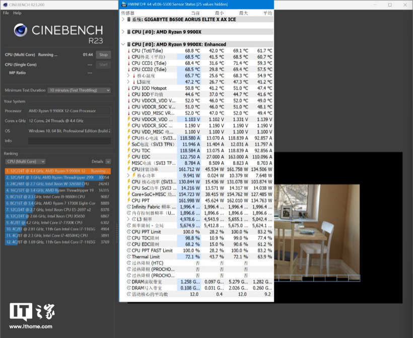 而这次,在 CineBench 的 10 分钟循环跑分中,我们发现 CPU 的温度降低了不少,只有不到 70°(68.8°)的水平、CPU 核心功率则一直保持在 130W;结合已经解禁的 9600X 和 9700X 在跑分时的温度表现(55° 左右),这一代“积热”问题总算得到了解决,对广大消费者来说绝对是个利好消息。