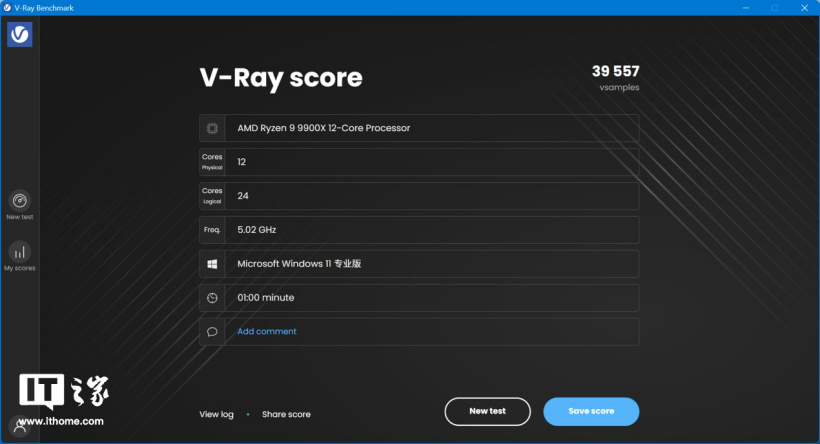 锐龙 9 9900X 拿到了 39557 分的成绩