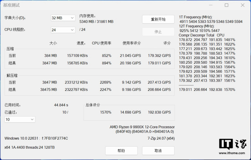 锐龙 9 9900X 的最大线程成绩为 192.838GIPS(=192838MIPS)