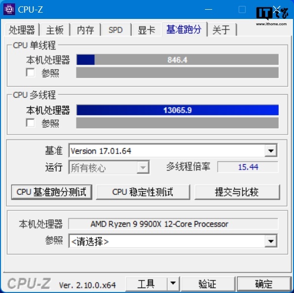 锐龙 9 9900X 的单线程得分为 846 分、多线程得分为 13065 分