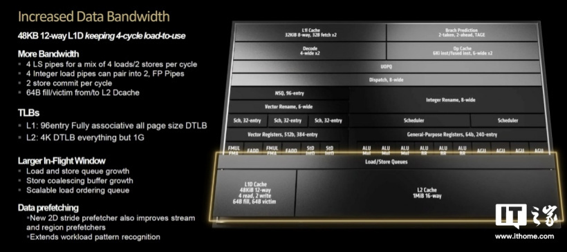 缓存方面,一级缓存由 Zen4 的每个核心 32KB+32KB 变为每个核心 32KB+48KB,一级缓存和浮点计算单元之间的数据峰值带宽增加一倍,并使用完整位宽的 AVX-512 指令集让 AI 性能也提升了一倍。二级缓存的变化则主要来自链路通道数量的增加,由 8 路增加到了 16 路,因此 L2 带宽也得到翻倍。