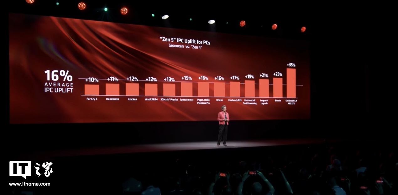 既然规格几乎相同,那么带来提升的最大功臣就莫过于全新的 Zen5 架构了,官方曾在 Computex 2024 的 AMD 主题演讲中表示:全新 Zen5 架构相对于上一代 Zen4 架构,实际应用和游戏中的 IPC 性能提升达到了 16%,提升幅度相当可观。