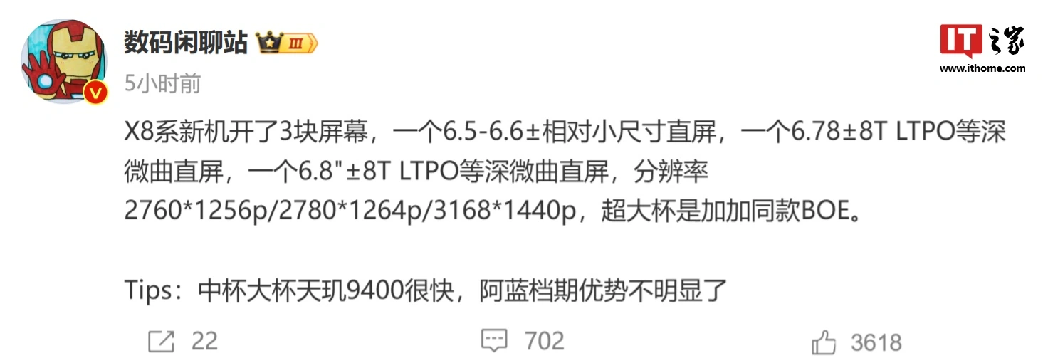 OPPO Find X8 :天玑 9400,1.5K“相对小尺寸(参考此前爆料为 6.5 英寸)”直屏,三摄单潜望,搭载光学指纹