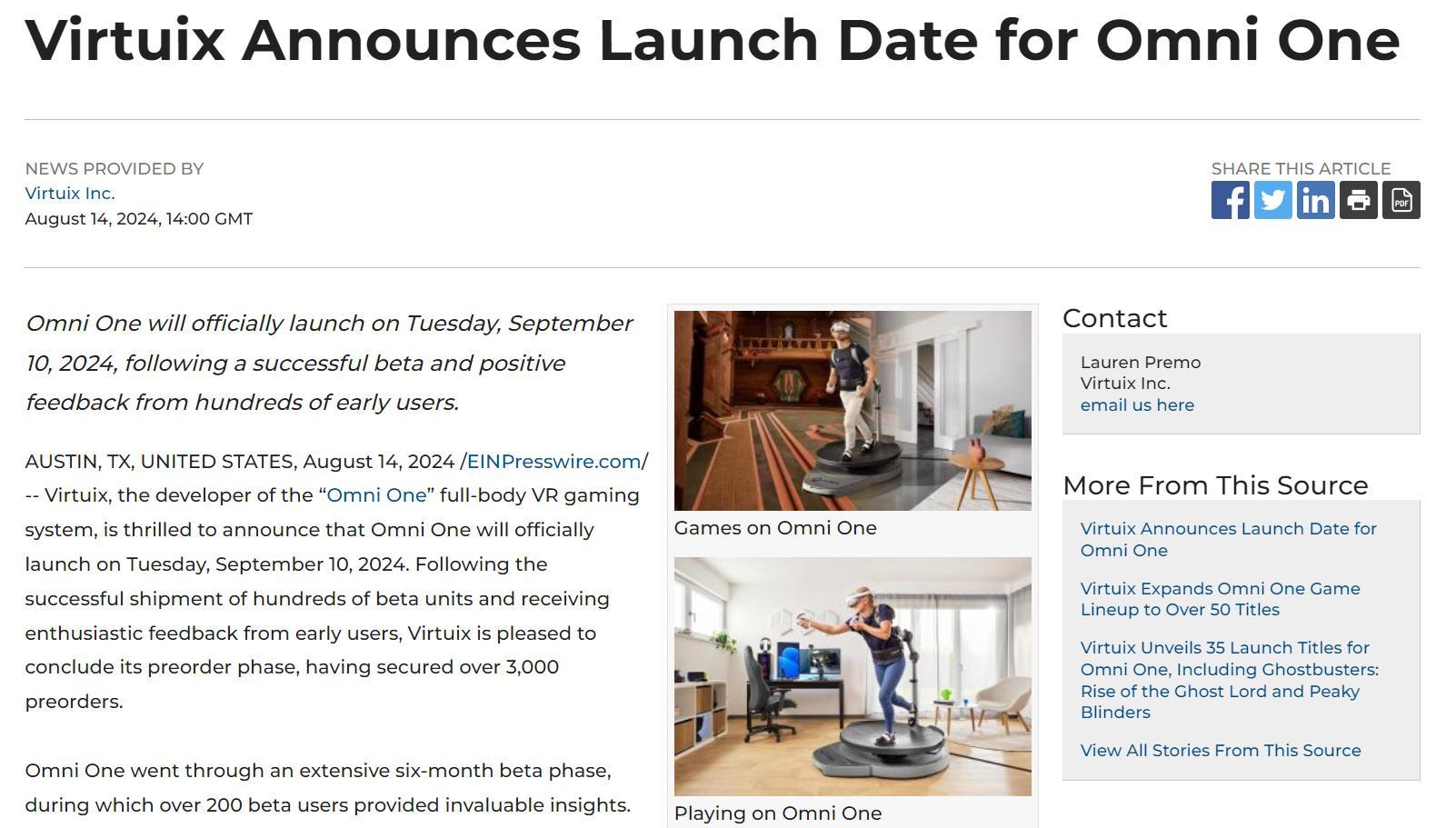 Virtuix的首席执行官Jan Goetgeluk表示,测试版用户的积极反应激发了公司的兴奋情绪,现在大家正迫不及待地想要推出Omni One,并改变所有年龄段的游戏体验。公司透露,预购期间已经卖出3000台。