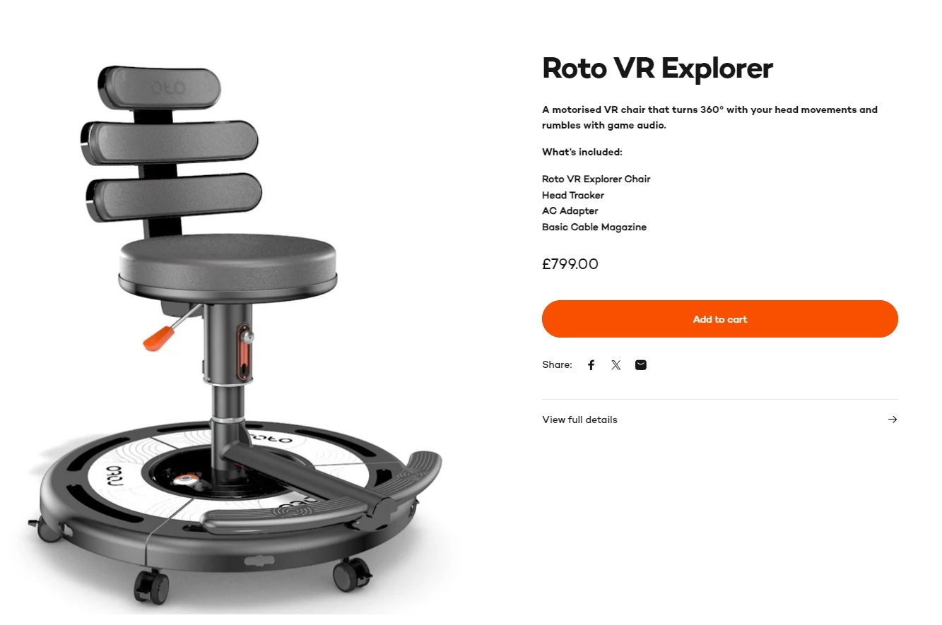 公司介绍称,这款设备旨在解决VR空间中360°观看内容的问题,由于椅子的运动与眼睛看到的信息同步,所以有助于避免大脑与身体感知脱节造成的晕动病。目前这款产品已经开放预购,售价为799英镑(约合人民币7322元),预计发货时间是今年10月。
