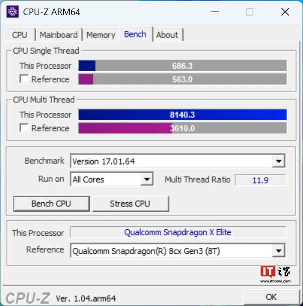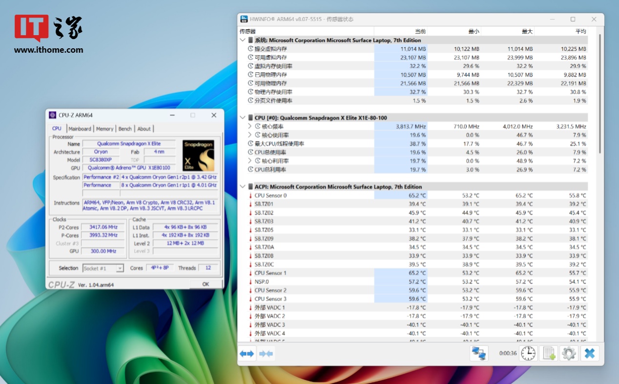 在 CPU-Z 中,X1E-80-100 取得了单核 686.3 分、多核 8140.3 分的成绩,相比前代的 8cx Gen 3 还是取得了长足的进步。