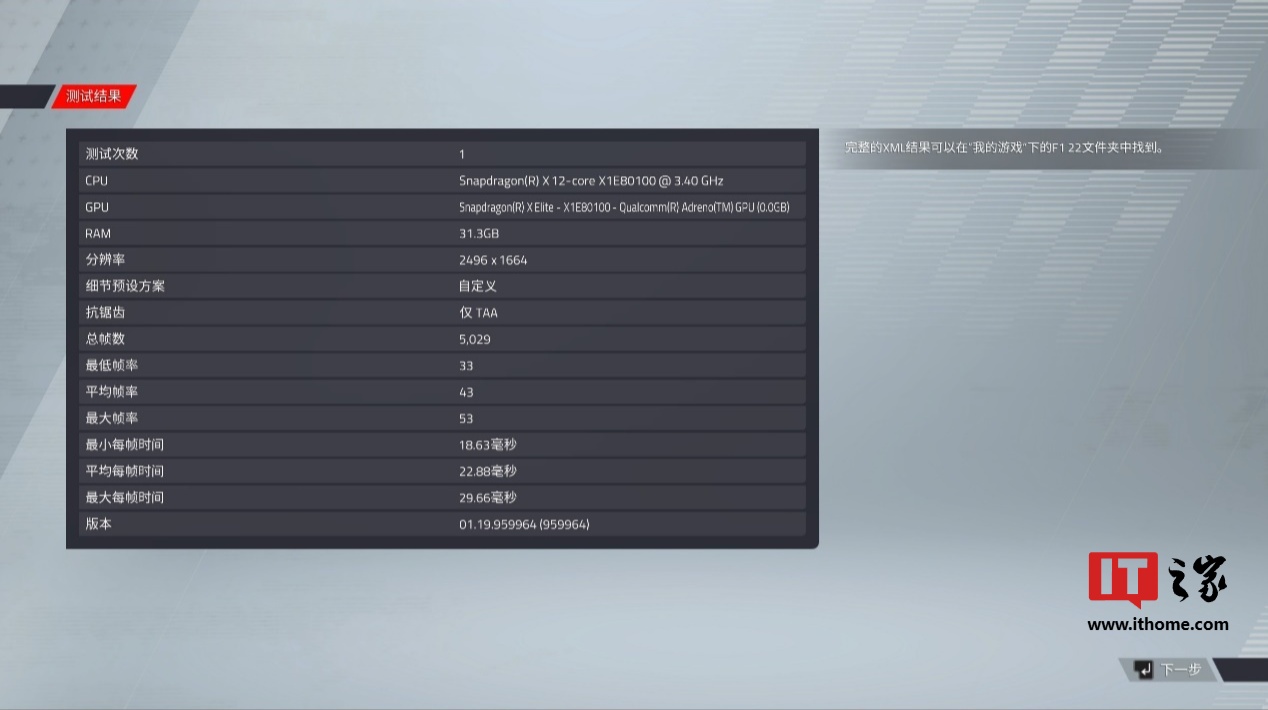 在使用为高帧率优化的 Ego 引擎的赛车游戏《F1 22》中,骁龙 X Elite 的表现不错。