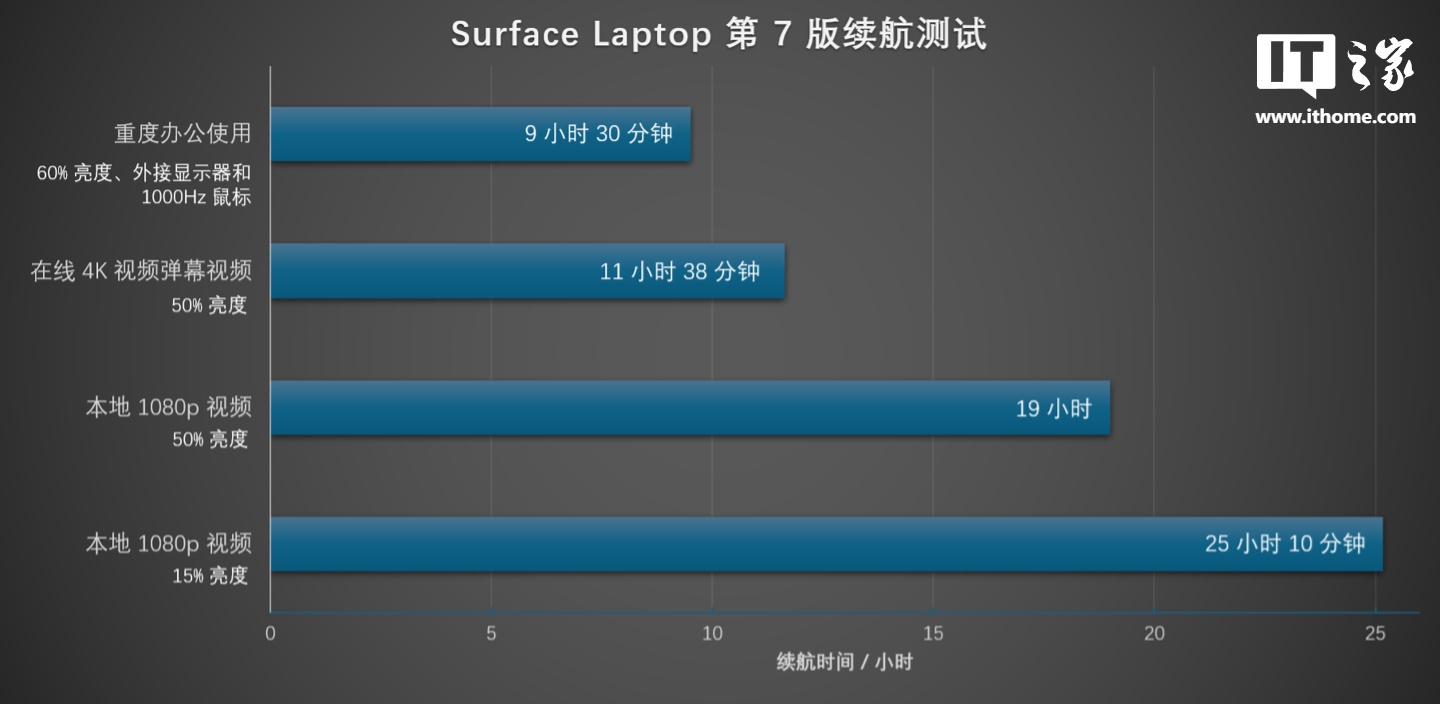 在负载更高的 4K 在线弹幕视频播放环节,Surface Laptop 第 7 版在 50% 屏幕亮度下达成了 11 小时 38 分钟的续航。