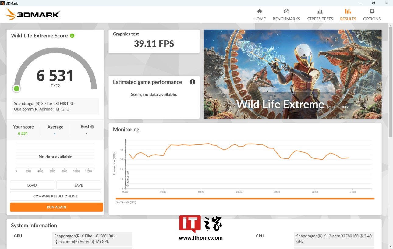 我们可以看到,骁龙 X Elite 在 Wild Life Extreme 测试中表现不错,取得了 6531 分、显卡 39.11 FPS 的成绩,领先于 X86 阵营的锐龙 R7 8845H。