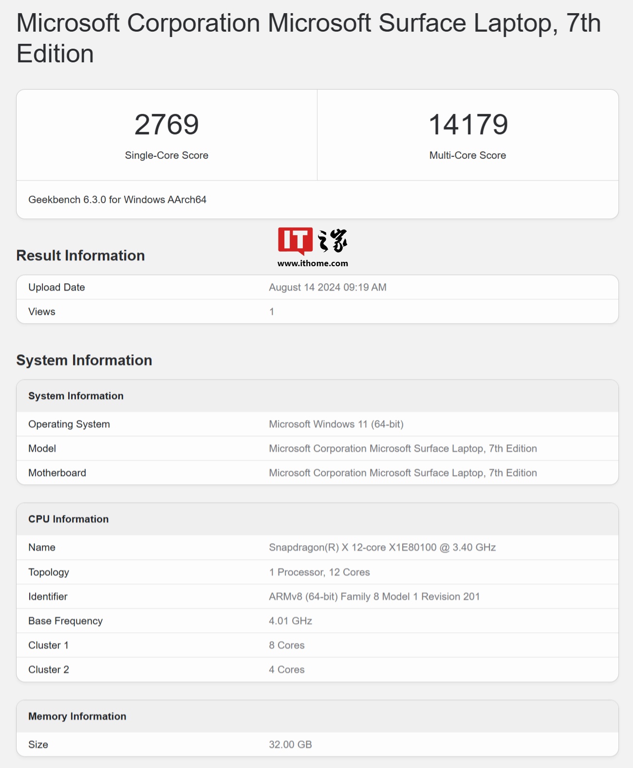 在更不容易触发散热瓶颈的 Geekbench 6 中,Surface Laptop 第 7 版上的 X1E-80-100 在最高性能模式下也取得了不俗的表现,单核 2769 分、多核 14179 分的成绩。