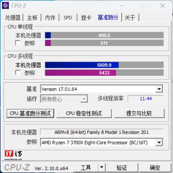 CPU-Z 测试中,X1E-80-100 取得了单核 490.5 分、多核 5609.0 分的成绩,转译折损大约 28.5% 的性能,大致与锐龙 R7 3700X 的水平接近。