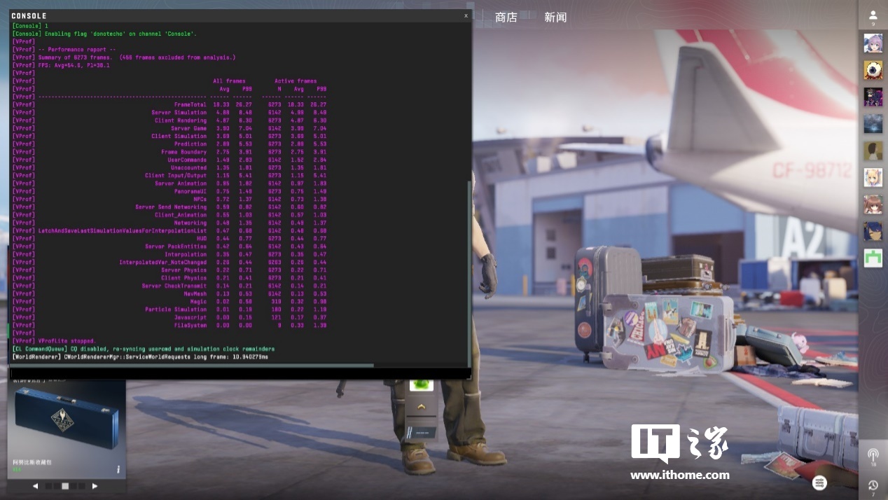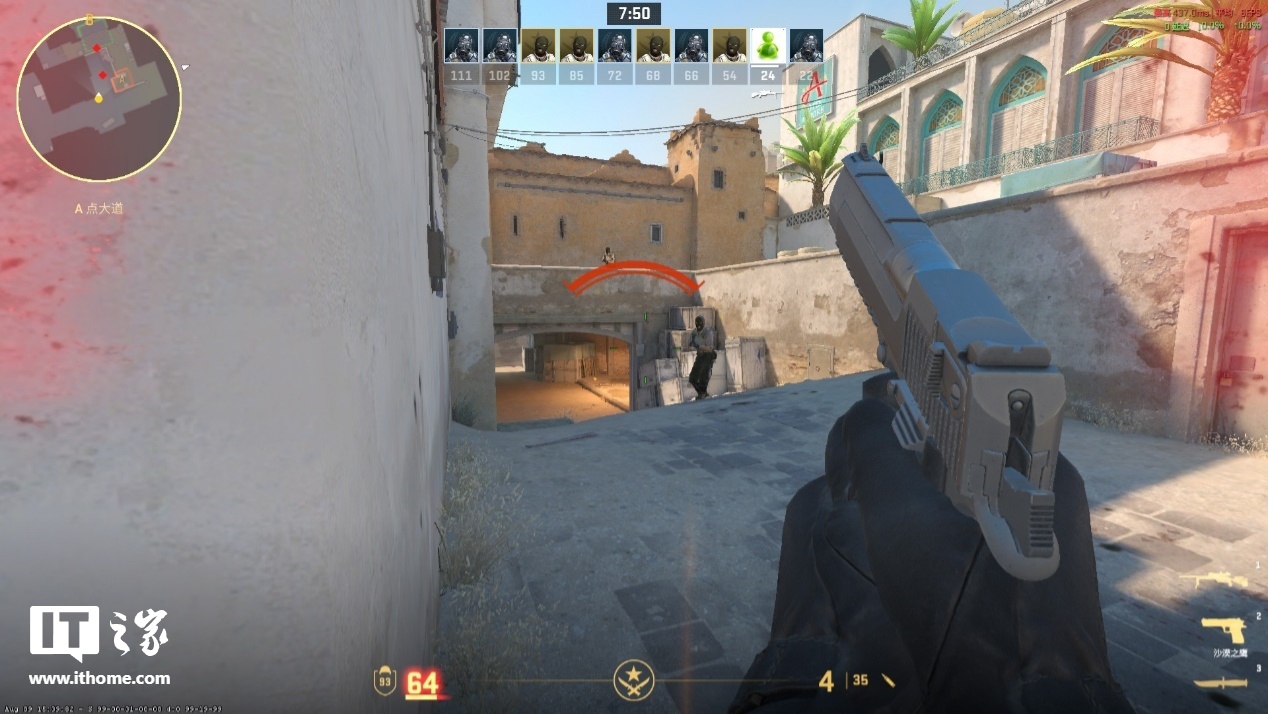 在 1080p 分辨率、低画质(关闭 FSR)的设定下可玩性有所改善,但是仍然难以瞄准对手。创意工坊中的 CS2 FPS Benchmark 测试结果为平均帧 54.6,1% Low 帧为 38.1。