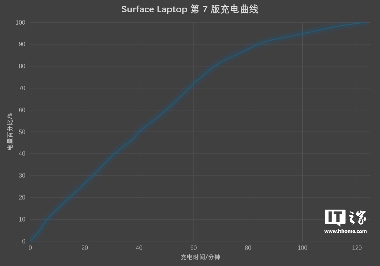 在小编实际的高强度办公(浏览器数十个 Tab、外接显示器、1000Hz 鼠标、开启多个聊天软件、屏幕亮度 60%)的使用过程中,15 英寸 Surface Laptop 第 7 版在 5 小时 25 分钟的时间内电量由 100% 降低至 43%,折合满电量的完整续航约为 9.5 小时。