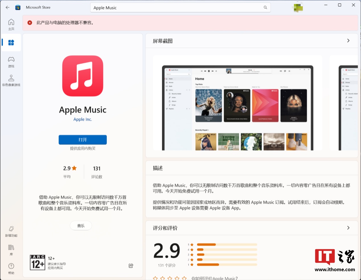 有趣的是,微软商店中一些“不兼容”的软件,如 Apple Music,在手动下载 appx 安装后却发现是可以完美运行的。