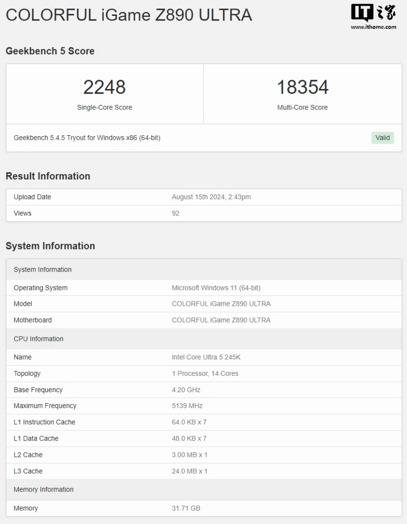 IT之家 8 月 15 日消息,今天有一套基于七彩虹 iGame Z890 ULTRA 主板的测试平台出现在了 Geekbench 上,搭载英特尔酷睿 Ultra 5 245K 处理器