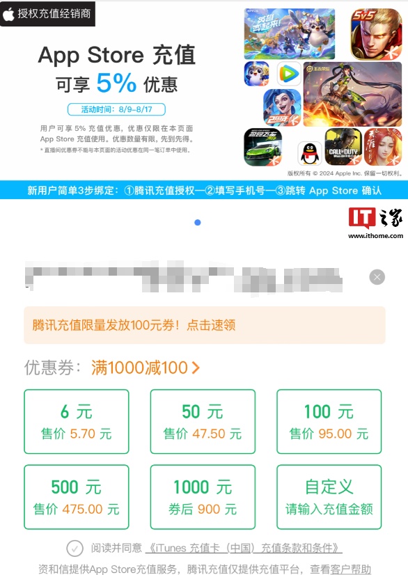 腾讯充值今日加码优惠活动,限量发放满 1000 元-100 元抵用券,有效期截至 8 月 18 日 23:59,仅 iOS 用户可领。