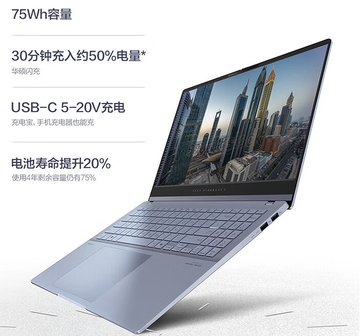 最后,华硕无畏 Pro15 2024 还采用了 75Wh 的大容量长寿电池,华硕闪充技术可以在 30 分钟充入 50% 左右的电量,且支持 USB-C 5-20V 充电,带着它上课,无需有低电量焦虑。