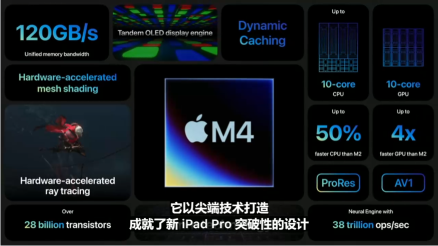 苹果 M4 芯片还搭载 10 核 GPU,相比 M2 速度提升 4 倍(渲染性能),首次为 iPad 带来动态缓存、硬件加速光线追踪和硬件加速网格着色功能;苹果 M4 还搭载 16 核神经网络引擎,运算速度达到每秒 38 万亿次,是 A11 芯片的 60 倍。