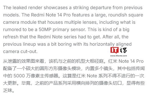 文章来源于互联网:IT之家-小米 Redmi Note 14 Pro 手机背面渲染图曝光,居中相机单元设计