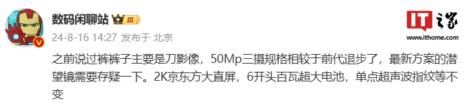 该博主爆料称,该机的 50Mp 三摄规格相较于前代退步了,最新方案的潜望镜需要存疑一下。2K 京东方大直屏,6 开头百瓦超大电池,单点超声波指纹等不变。