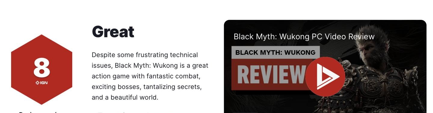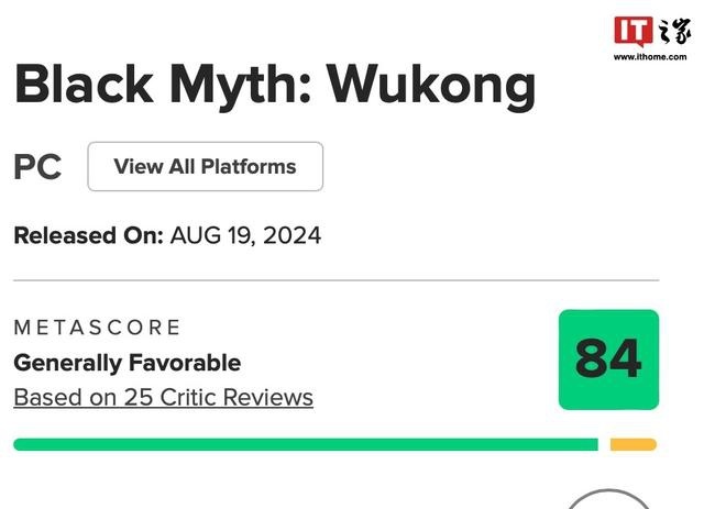 IT之家 8 月 16 日消息,《黑神话悟空(Black Myth:Wukong)》媒体评分目前已经解禁,本作获得 IGN 中国 10 分评价(IGN 海外评分为 8 分),截至IT之家发稿,Metacritic 评分为 84 分(由 25 家媒体给出)。