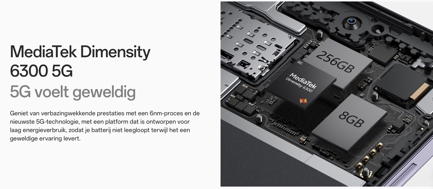 外观方面,该机可选星黑色和紫色两种配色,采用直角中框,其搭载一块 6.67 英寸 FHD+ 120Hz IPS LCD 打孔屏,配备八核心联发科天玑 6300 芯片,作为参考,该芯片于今年 4 月推出,其中包含了 2 个 A76 大核和 6 个 A55 小核,主频分别为 2.4GHz 和 2.0GHz,GPU 则是 Mali G57 MC2。