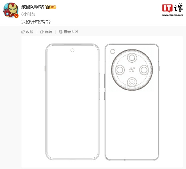 再看第二张线稿,该机同样采用后置居中大圆镜头、四摄对称排列,长条形闪光灯则挪至机身右上方。相机模组中间的 logo 神似蔡司,有网友推测该机为 vivo X200 系列。