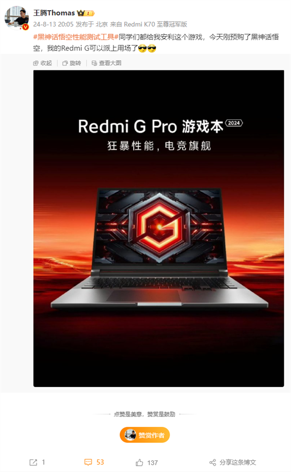 今早,Redmi品牌总经理王腾微博发文,称“早,到公司第一件事情就是”,从配图来看,王腾今天上班先开电脑进行《黑神话:悟空》预下载。