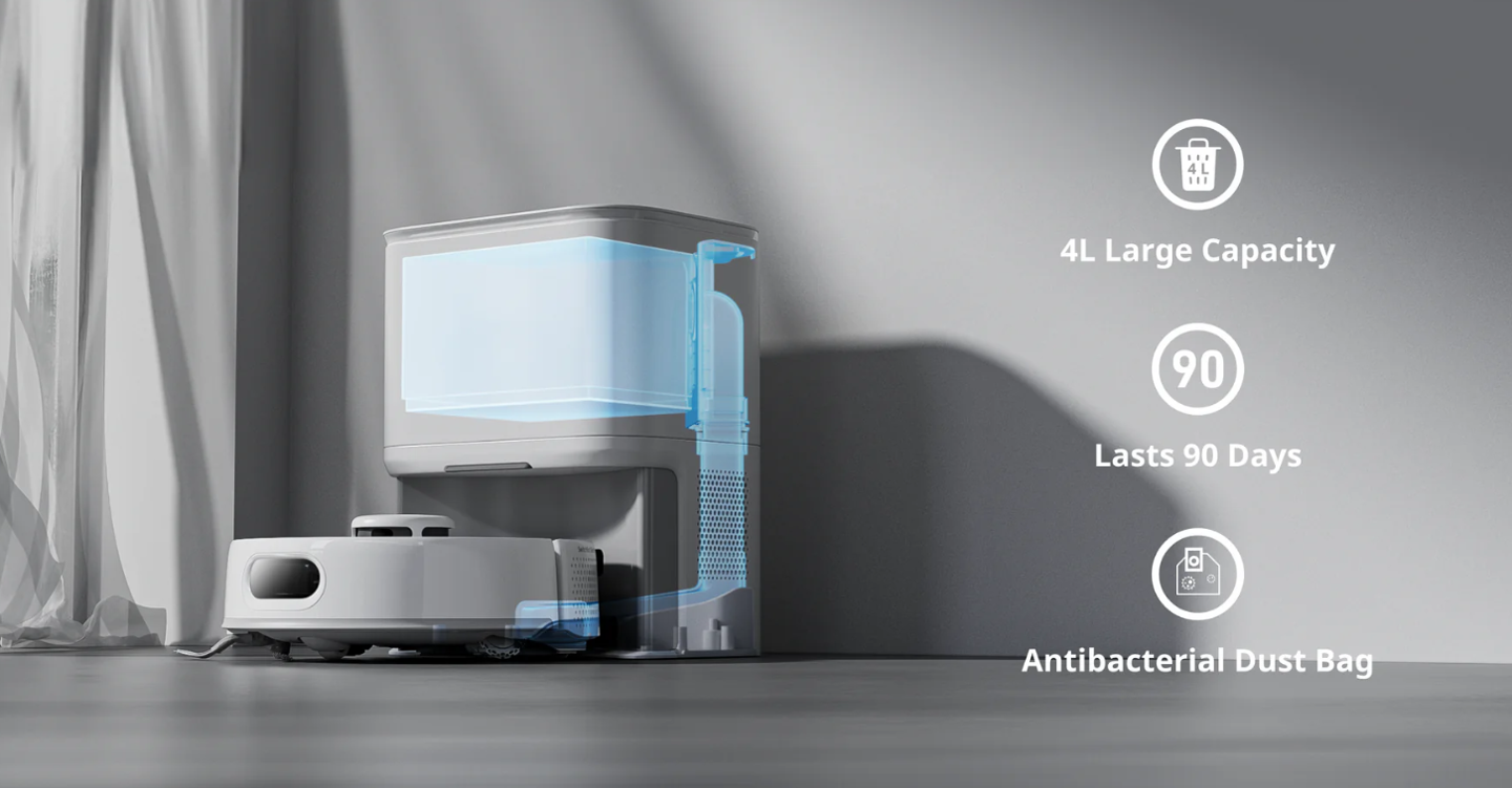 该机搭载了一个 4L 的抗菌集尘袋,官方宣称可以每 90 天清空一次。续航方面,该机号称一次充满电可以清扫 225 平方米。