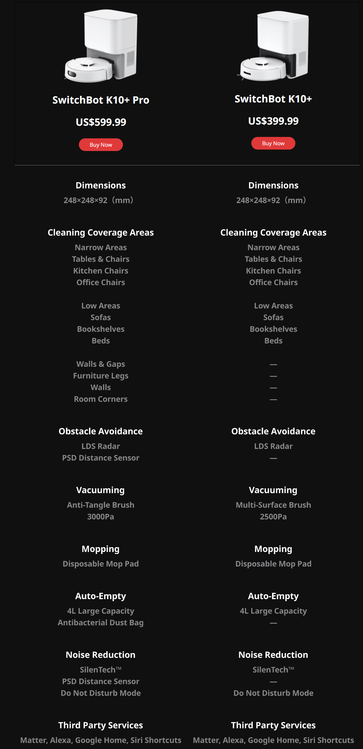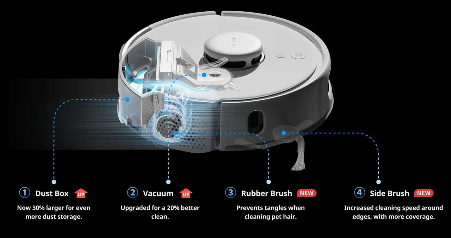 该机拥有更高的清洁能力 —— 3,000 Pa,而 K10+ 为 2,500 Pa。新型防缠结橡胶刷可以让用户更方便地处理宠物(或人类)毛发。SwitchBot 声称其 SilenTech 技术在“静音”模式下将噪音水平保持在 45 分贝。