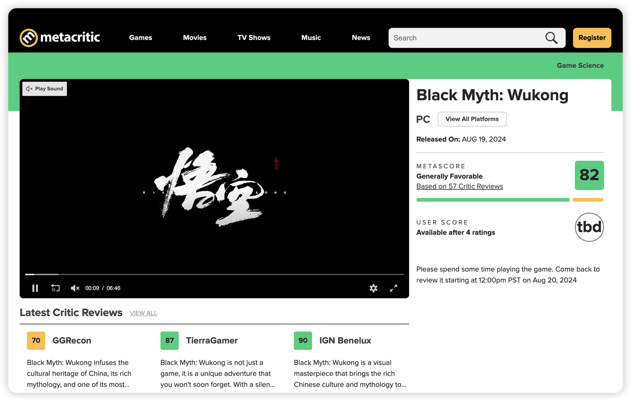 截止至《黑神话:悟空》上线前夕,综合评分网站 metacritic 对于本作的评分为 82 分,共收录了全球 49 家核心媒体评分,在 2024 年的动作游戏里可以排得上前几名——这对于一个没有 3A 游戏开发经验的初创团队而言,是尤为难得的成绩。