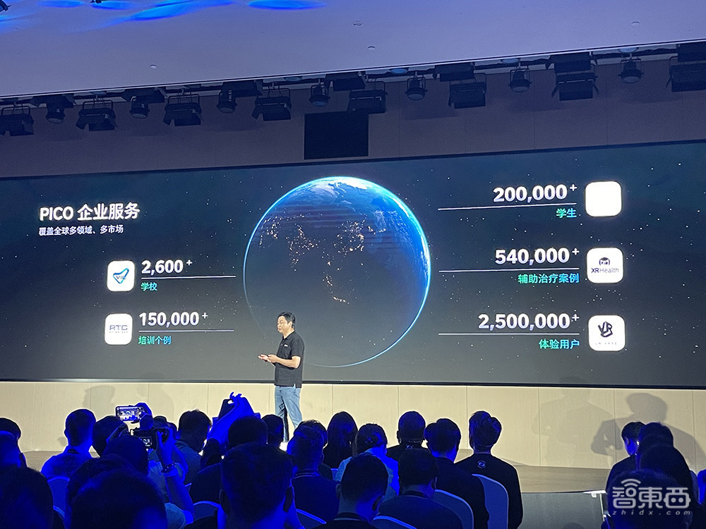 PICO企业服务覆盖全球2600多所学校,为20多万学生提供使用VR进行学习的支持,在医疗领域与合作伙伴一起为超过54万名患者提供辅助治疗。