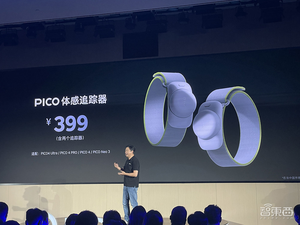 到One more thing环节,PICO产品经理唐贞展示了PICO体感追踪器。该追踪器与PICO头显无缝协作,只要将两个追踪器佩戴在脚踝上,就能实现全身追踪。