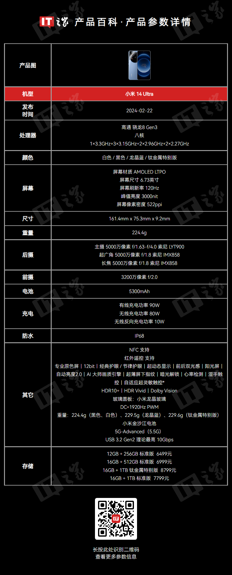 作为比较,现款在售小米 14 Ultra 手机发布于今年 2 月 22 日,该机采用经典三段式设计,全包裹式金属中框,提供“陶瓷版本(龙晶蓝)”和“素皮版本(黑白)”,其中“陶瓷版本”采用“小米龙晶陶瓷(比传统陶瓷轻 50%)”,重 229.5g,“素皮版本”采用“科技纳米皮”,重 224.4g,小伙伴们可以查看IT之家评测组进行的体验上手。
