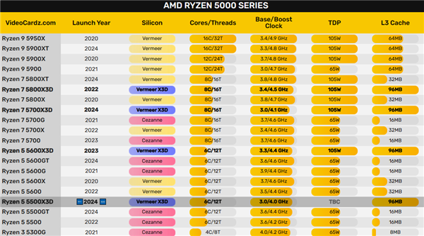 有趣的是,AMD最近还有望发布锐龙5 5500X3D,也是6核心,去年11月就已曝光,AM4接口,预计频率3.0-4.0GHz,热设计功耗65W。