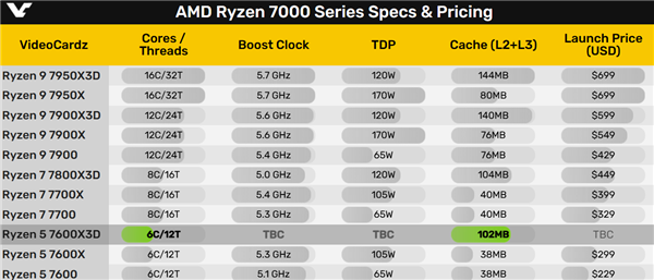 锐龙7000X3D系列此前有三款型号,分别是16核心的锐龙9 7950X3D、12核心的锐龙9 7900X3D、8核心的锐龙9 7800X3D,分别有144MB、140MB、104MB二三缓存,热设计功耗均为120W。