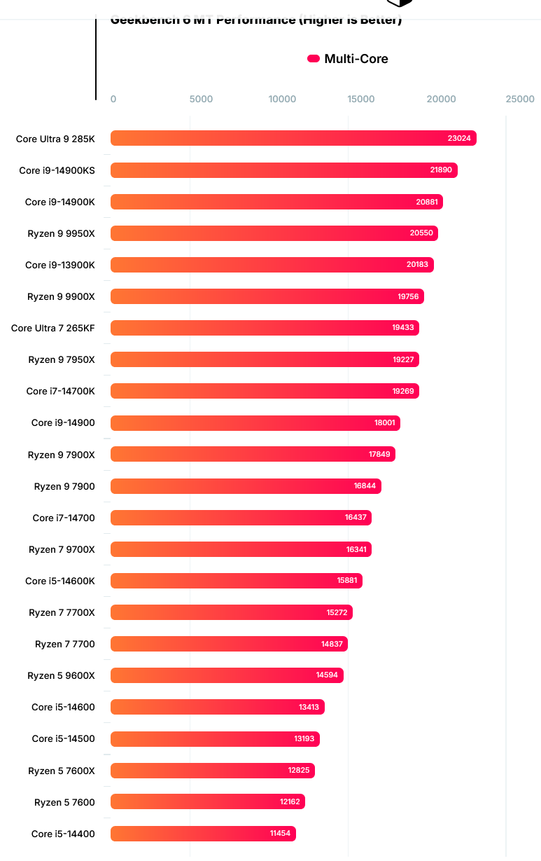 IT之家 8 月 21 日消息,科技媒体 WccFtech 今天报道,英特尔酷睿 Ultra 9 285K“Arrow Lake”处理器现身 GeekBench 6 跑分库,超过酷睿 i9-14900KS 和 Ryzen 9 9950X 处理器。