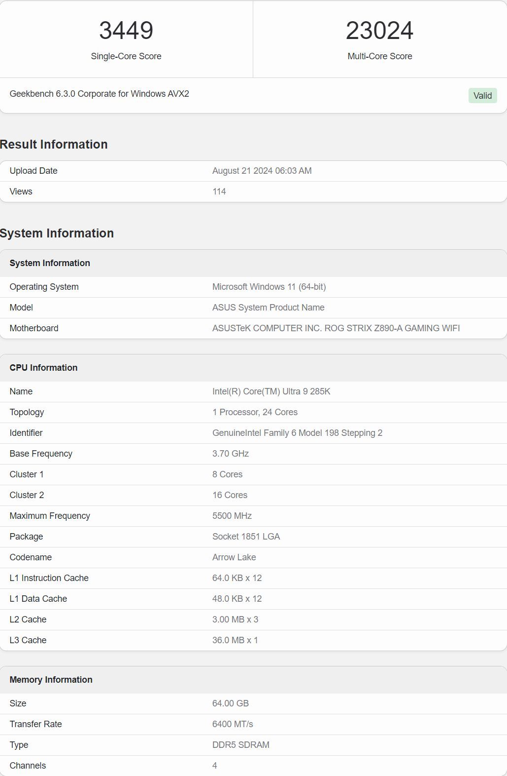 英特尔酷睿 Ultra 9 285K 处理器在 GeekBench 6 跑分中,单核成绩为 3450 分,多核成绩为 23024 分。