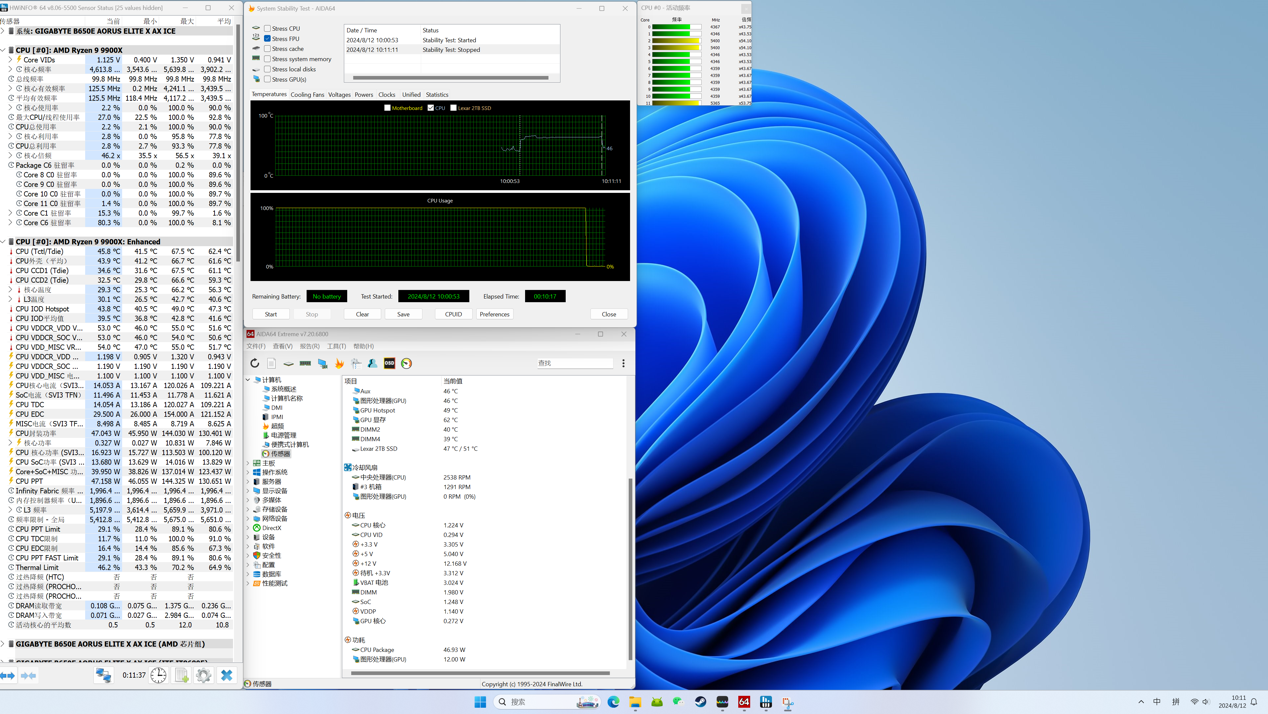 首先来看主板的供电表现,在 AIDA64 的单烤 CPU 测试中,未开始烤机的情况下,锐龙 9 9900X 的 CPU 功耗在 45W 左右,此时 CPU 会有 2-3 个核心频率顶到 5.4GHz 左右,而剩下的核心则都在 4.3GHz 左右。