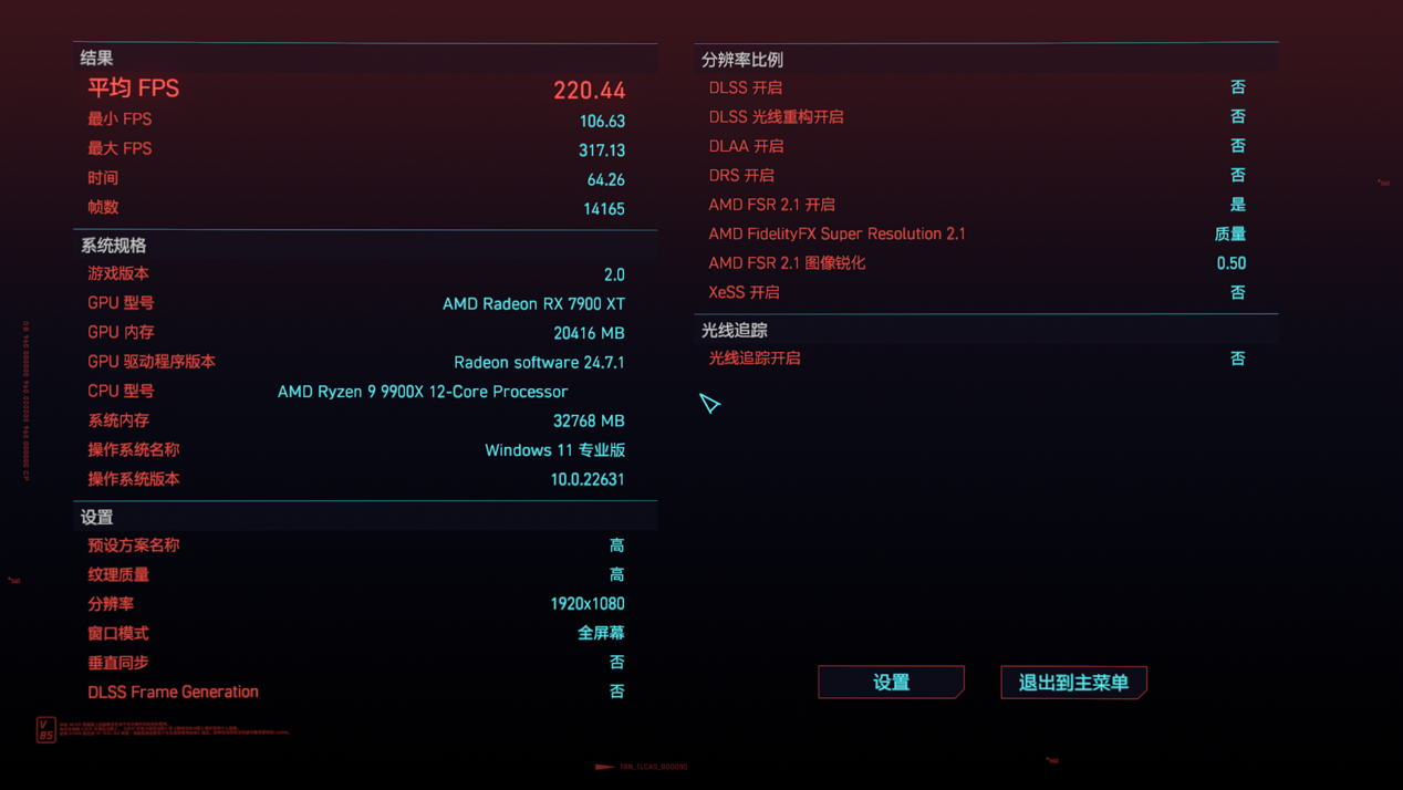 最后是压力最大的《赛博朋克:2077》,使用高画质 + 1080P 分辨率,不开启光追和 FSR / DLSS 选项,运行游戏自带基准测试,最终游戏平均帧数达到了 220 帧,1% Low 帧为 148 帧。