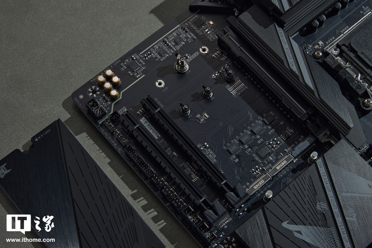 PCIe 插槽之间的散热装甲盖板下方,配了 3 个 M.2 固态插槽,其中的两个插槽都是 PCIe5.0 规格,另一个是 PCIe4.0 规格,也就是 3 个 PCIe5.0+1 个 PCIe4.0 的 M.2 扩展规格组合,能够轻松满足用户的大容量扩展需求。