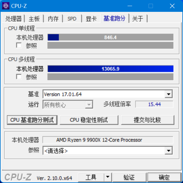 在 CPU-Z 的测试中,锐龙 9 9900X 单线程得分 846 分,多线程得分 13065 分,属于正常的水平。