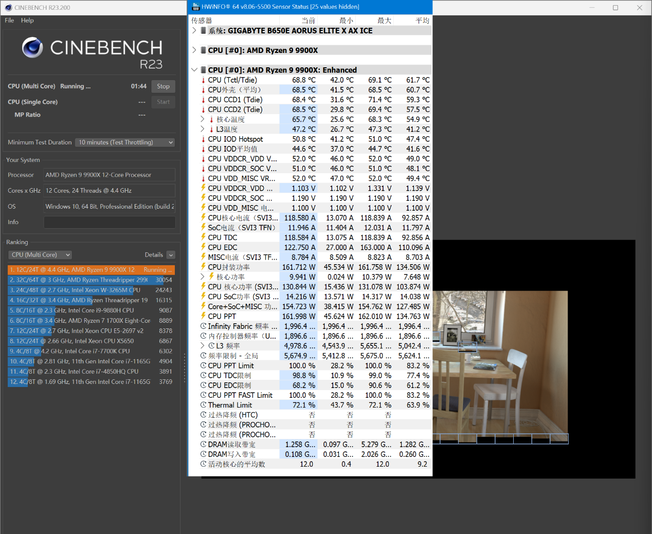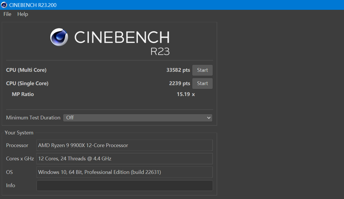 在 CineBench R23 的测试中,锐龙 9900X 的到了 2239 分的单核成绩以及 33582 分的多核成绩,甚至比一些 X670E 主板在不开启 PBO 时的表现要更好一些。