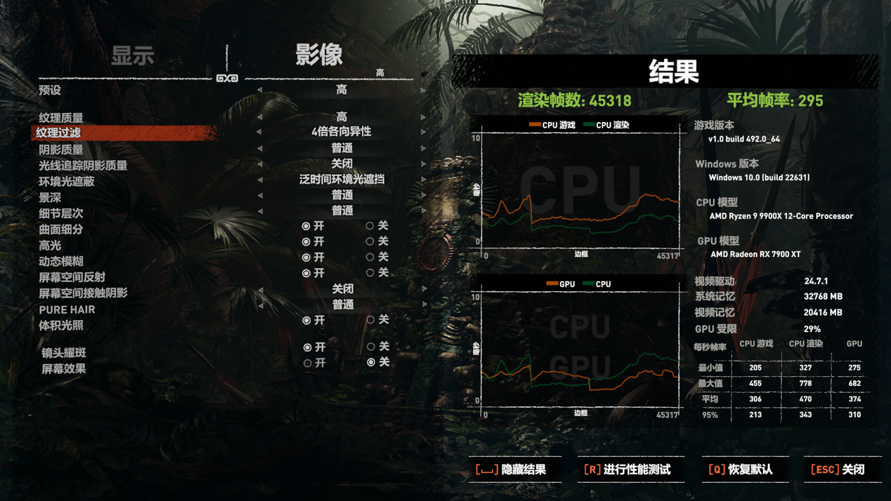 在传统光栅 3A 游戏《古墓丽影:暗影》中,以 1080P 分辨率 + 默认高画质预设选项,运行游戏自带基准测试,锐龙 9 9900X 的游戏平均帧数为 295 帧,1% Low 帧为 181 帧。