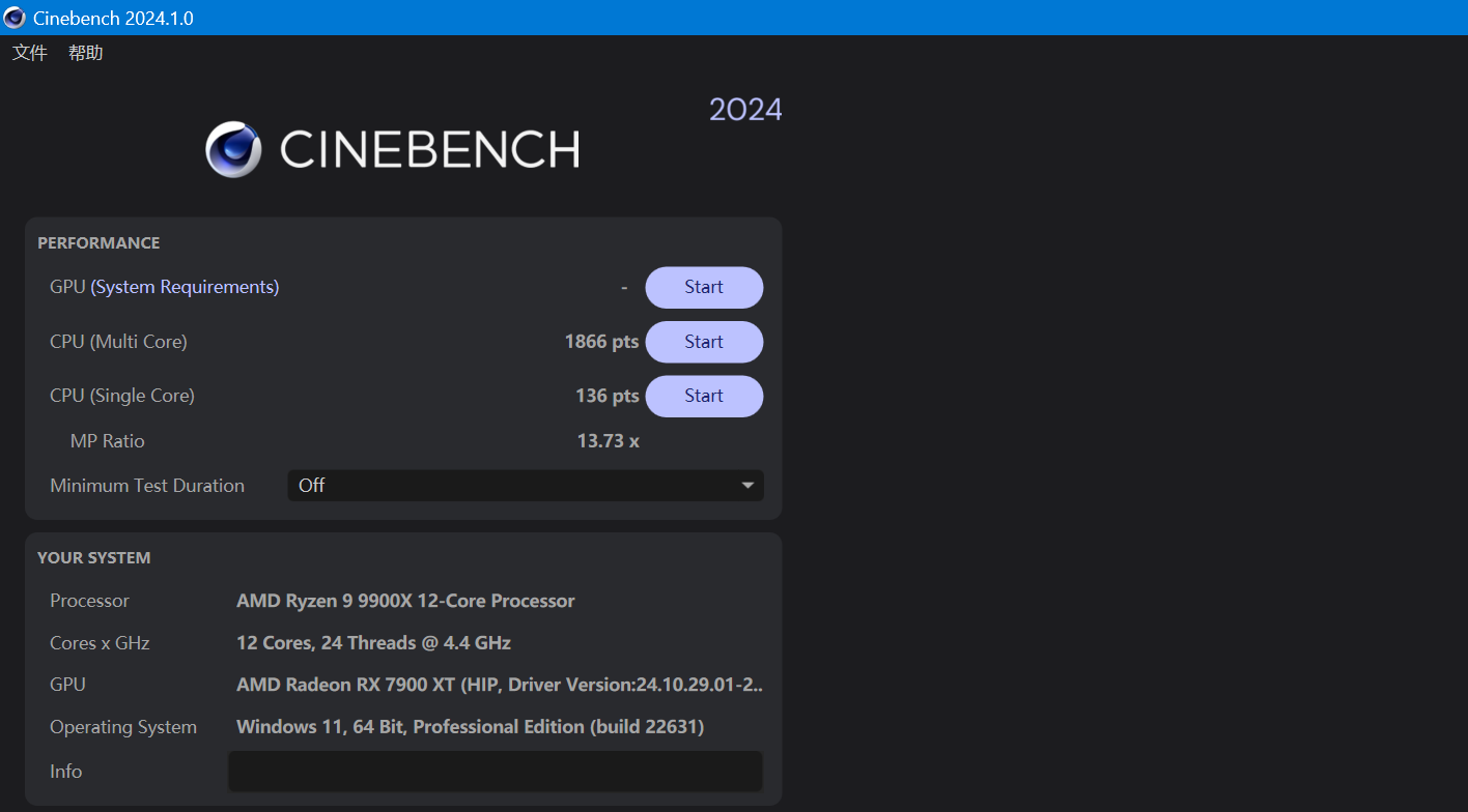 在 CineBench 2024 的测试中,锐龙 9 9900X 的发挥依旧出色,单线程得分 136 分,多线程得分 1866 分。