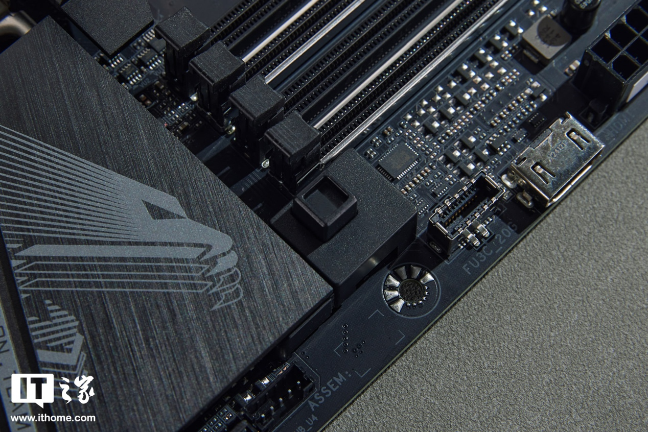 值得一提的是,技嘉 B650E 电竞雕 USB4 主板这次在内存插槽右侧下方配备了一个独立的主 PCIe 插槽快拆按钮,用户安装或拆卸显卡时,只需按住该按钮,即可轻松插入或取下显卡,让用户的装机操作更加方便。与快拆按钮右侧紧挨着的是一个 USB-A 接口,允许玩家通过它连接副屏,进一步扩展机箱内部的功能性或装饰性。
