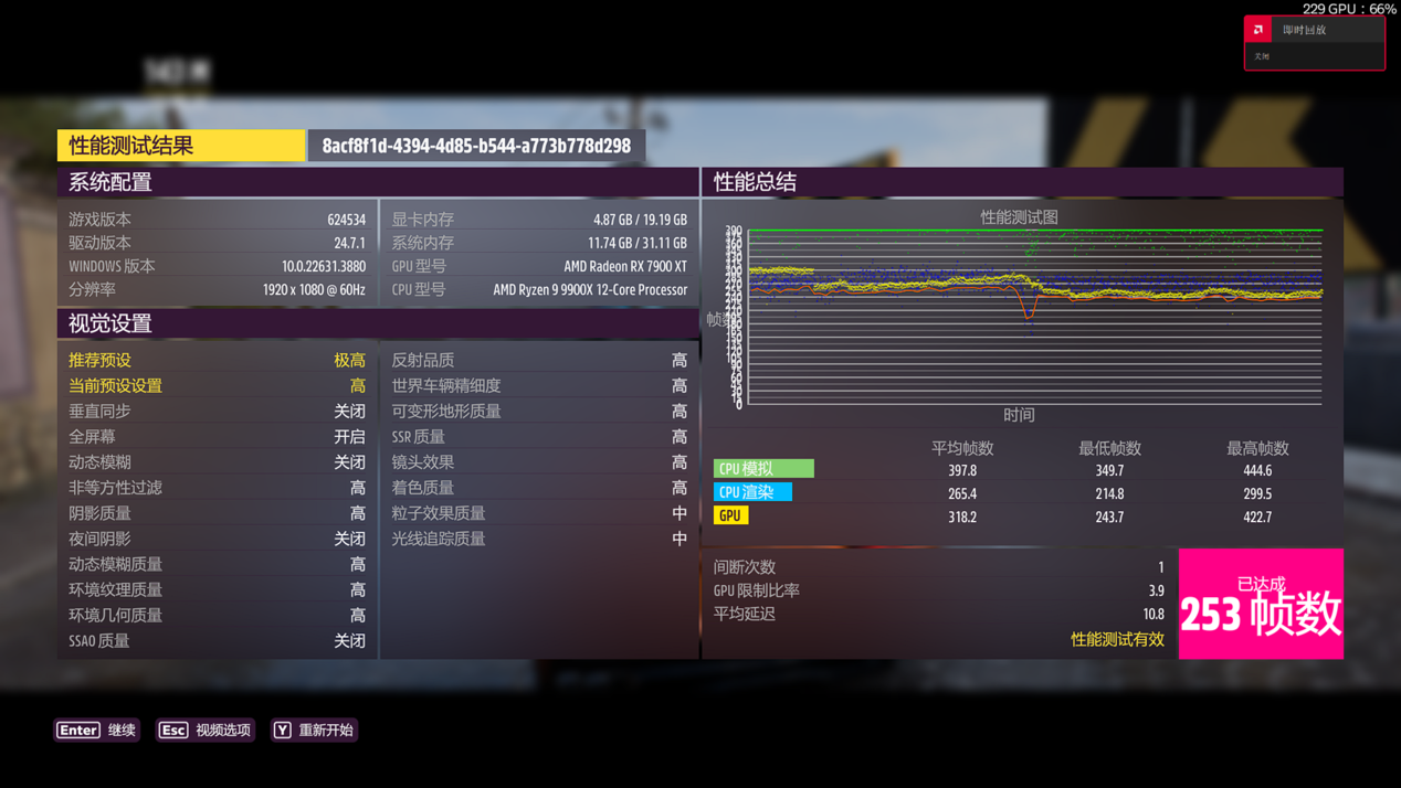 在光追赛车竞速游戏《极限竞速:地平线 5》中,默认高画质自带开启了中等级的光线追踪质量,以 1080P 分辨率、通过自带基准测试测得锐龙 9 9900X 的游戏平均帧数为 253 帧,1% Low 帧为 164 帧。